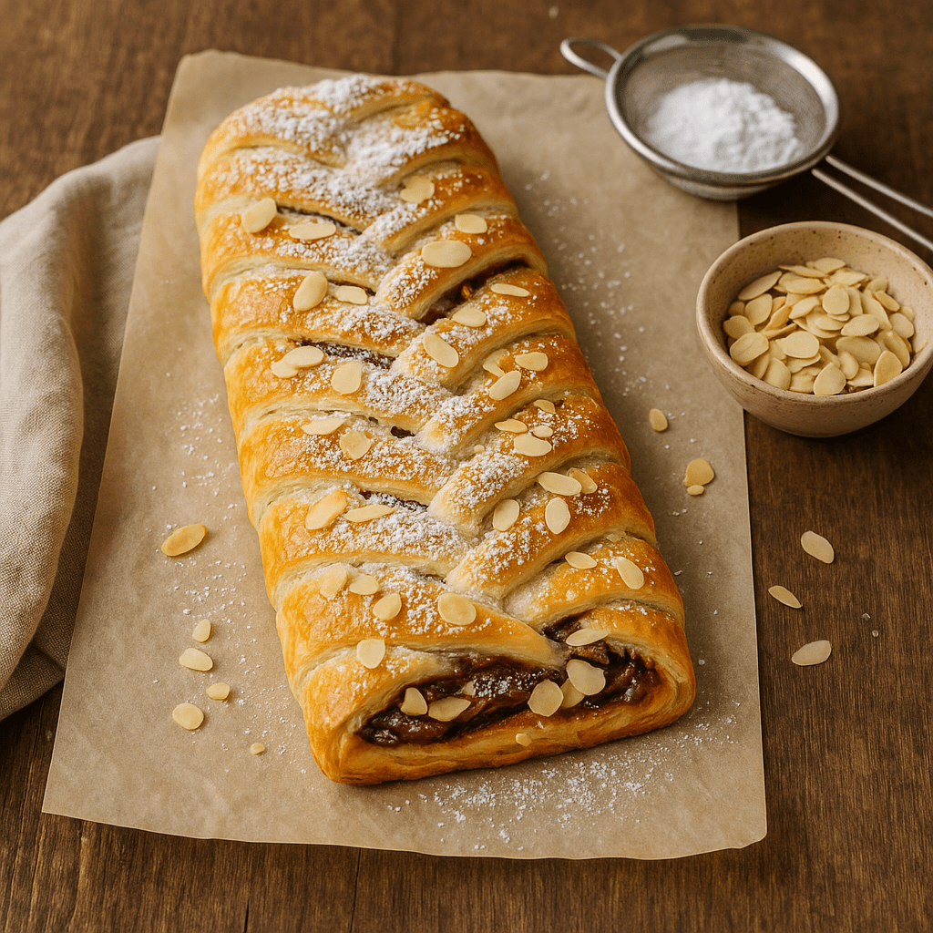 Las trenzas de hojaldre tienen su origen en las pastelerías centroeuropeas, donde se elaboraban con masas enriquecidas y rellenos de frutos secos para soportar los fríos inviernos. Con el tiempo, esta preparación se popularizó en muchos países gracias a su sencillez y a su capacidad para transformar ingredientes cotidianos en un dulce festivo y aromático. La versión con crema de avellanas y almendra es una de las más extendidas en la repostería moderna, combinando el crujiente del hojaldre con un interior suave y goloso, ideal para compartir en vísperas de celebración.